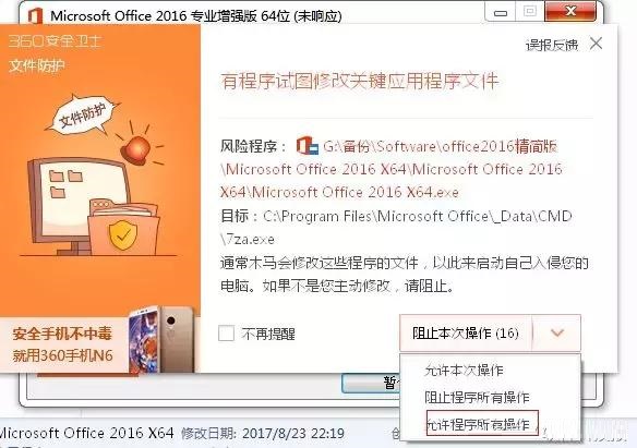 注:在安装过程中会提示误报的情况,此时点击“允许程序所有操作”即可(因为此精简版中,内含了KMS激活程序,误报属正常现象,建议安装之前退出防护程序)