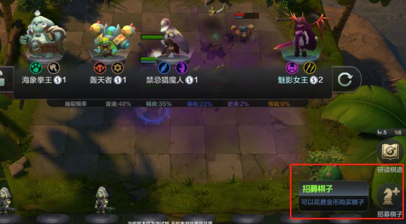 购买棋子:在棋子商店可花费金币购买棋子,棋子商店在回合开始时自动刷新