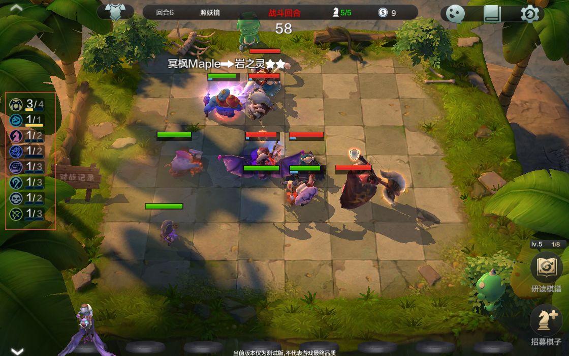 棋子上阵后,等待倒计时结束,场上棋子将自动为您作战,对手是随机敌对玩家或者AI(野怪),所以如何挑选强力棋子组成强力组合是本游戏的主要玩点。