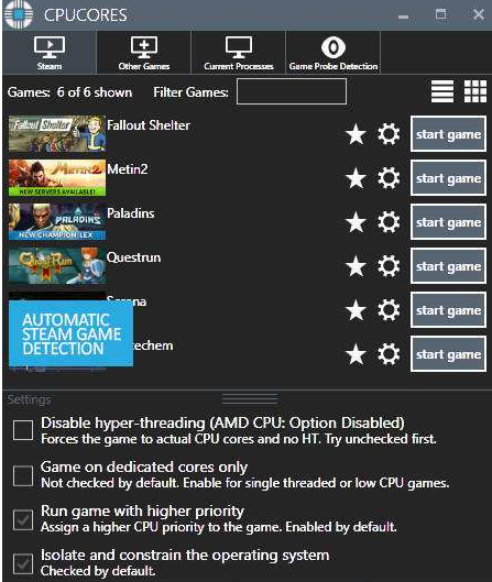 cpucores自动检测你所有的蒸汽游戏。它还自动整合蒸汽发射能力的游戏。你只需要运行cpucores内蒸汽,选择您希望运行优化蒸汽的游戏,然后点击“开始游戏”按钮,在cpucores。是这么回事!