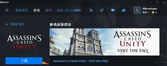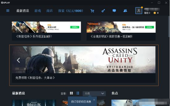 第五步:登录进uplay客户端后,在最新消息下就能看到《刺客信条:大革命》免费领的消息,点击进入;