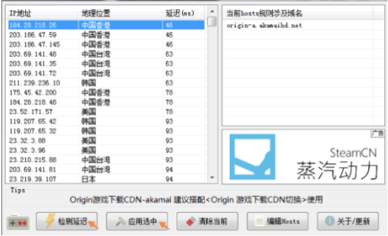 第三步:出现ip列表后,点击【检测延迟】;选择延迟比较低的,再点击【应用选中】。需要注意的是:如果后面速度不理想,可以多换几个IP试试!