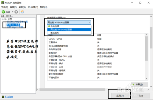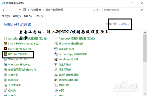 步骤三:打开电脑控制面板,选中查看小图标,打开的NVIDIA控制面板中,我们在左侧的3D设置中,点击【管理3D设置】,然后在右侧的【全局设置】中,将首选图形处理器下方的选项,更改为【高性能NVIDIA处理器】,完成后,记得再点击底部的【保存】即可,如下图所示