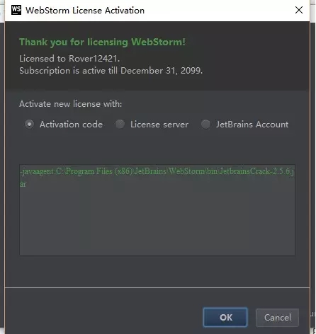 第一步: 复制下方activation code,直接粘贴在webstorm的activation code栏上,先不要点ok,等第二步执行完之后再点OK。