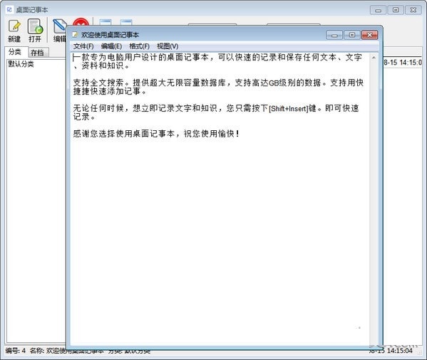 桌面记事本是一款界面简洁,功能实用的记事本软件,使用起来非常的方便,按shift+insert键可快速添加新记事,使用它您就可以快速的记录和保存任何文本、文字、资料和知识,同时还可以根据时间和分类来管理这些记事文档。【软件功能】