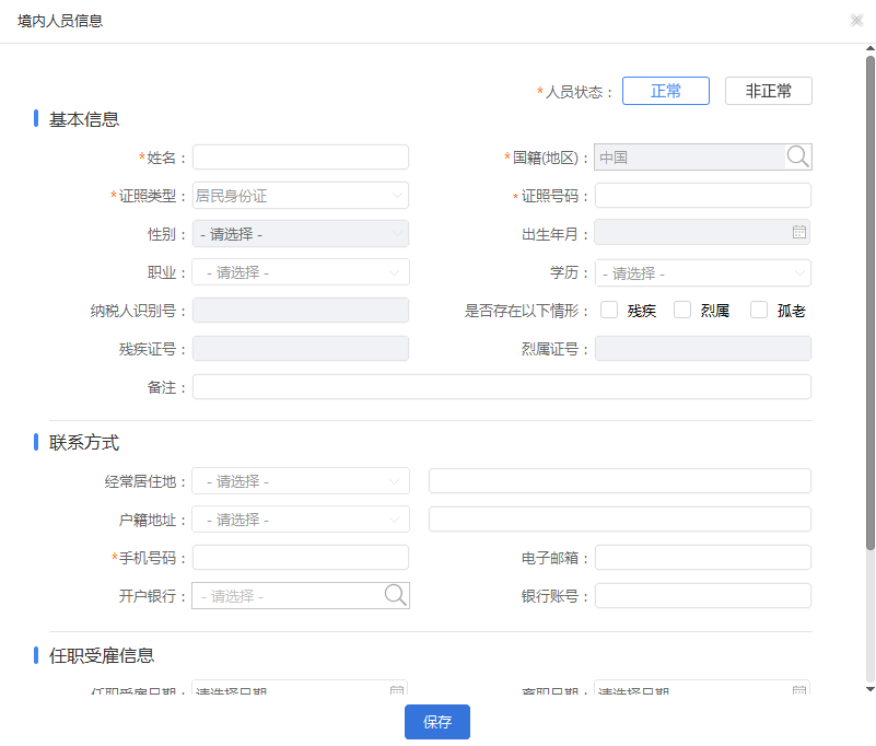 打开对应报表后,填写相关申报数据。数据填写方式与【人员信息采集】功能类似,可以单个人员添加,也可以批量导入,支持修改以及删除。