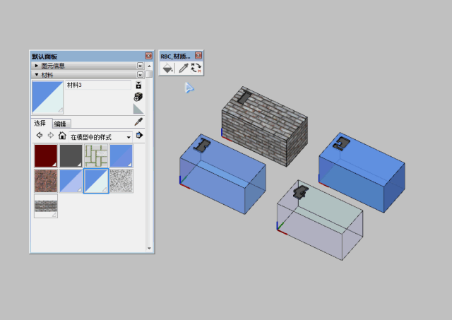 材质吸管:SketchUp中的材质有贴图、颜色和透明度三种属性,通过材质吸管工具可以复制场景中其它贴图的属性。