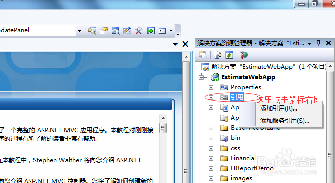 打开一个既有的Microsoft Visual Studio 项目,在右边解决方案处找到“引用”,如下图。