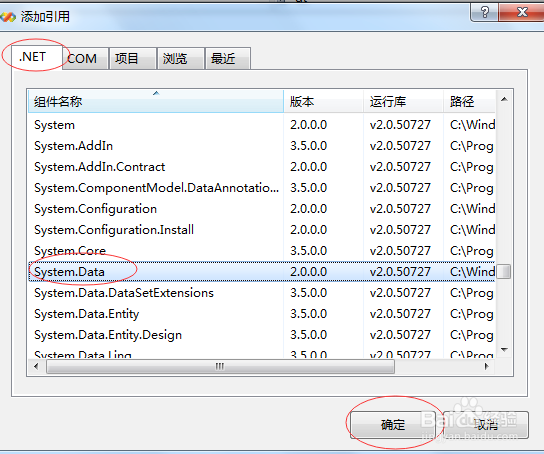 这时候在解决方案那边右键点击“引用”,弹出引用对话框,在.NET选项下面找到 System.Data,这个是按拼音进行排序的,所以比较好找。选中他,点击确定如图1标红的框,你就会发现右边引用中就多了这个引用,效果如图2。这时候你重新生成解决方案,你就会发现不会再报这个错误了。
