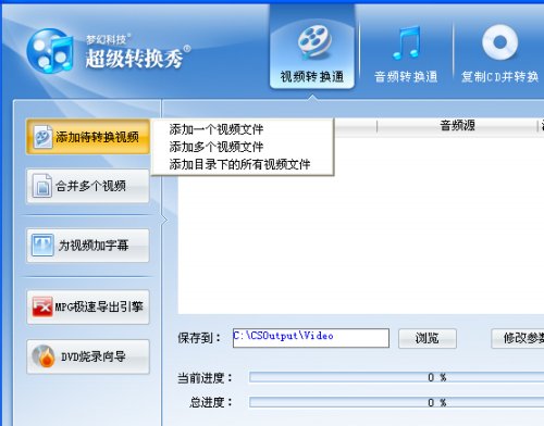 如下图,是超级转换秀“视频转换通”的主界面,除了对视频的转换和基础编辑功能,超级转换秀还支持进行音频转换和编辑,CD抓轨,功能非常全面。软件的界面也非常清新,即便是新手,也能顺利看出条理。