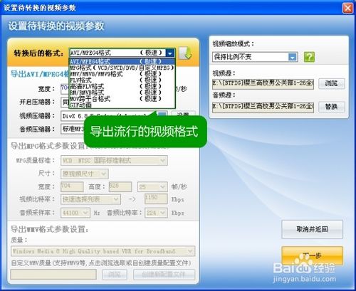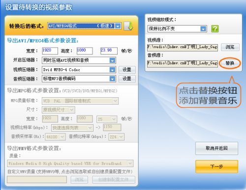 接着进入“设置待转换的视频参数”对话框,在右栏目的“音频源”处点击“替换”按钮,即可为视频替换成你喜欢的音乐。关于消音:请在“转换后的格式”的下拉框中选择导出WMV格式,然后点击“创建自配置文件”按钮,在弹出框中,将“使用音频流”处的勾去掉即可实现消音的功能。