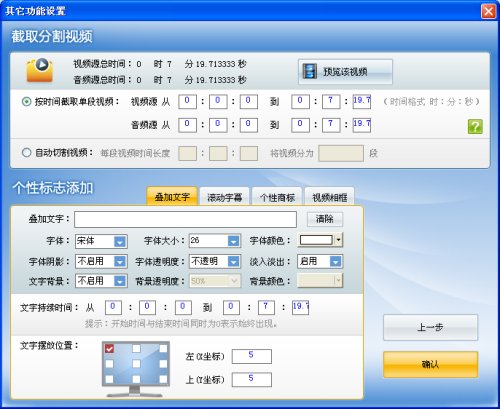 我们还可以将视频最精彩的部分截取,并为视频添加滚动字幕、个性商标、还有精美的视频相框等功能。只需在“其它功能设置”对话框中即可轻松实现的。