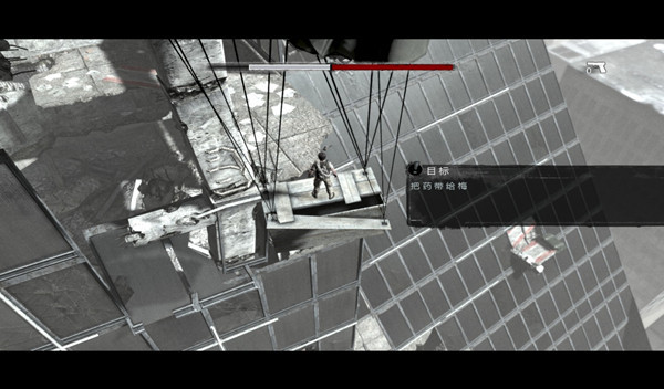抓钩跳过去爬上水管,遇见敌人杀死后,进入升降机,完成目标!