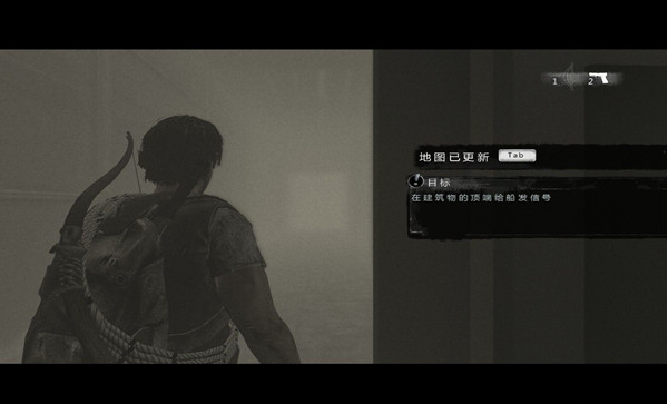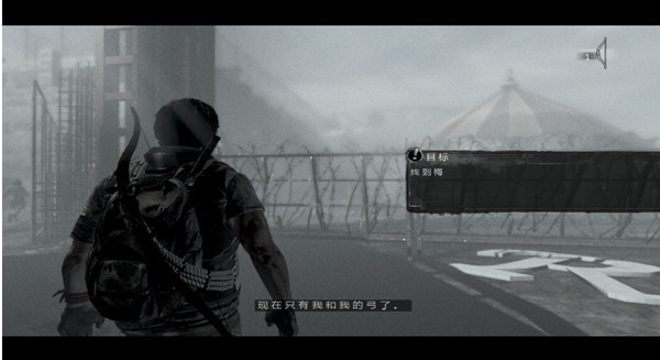 主角带梅见到亨利后得到了一把猎弓(滚动鼠标滚轮可切换手枪和猎弓)下电梯沿着街道一直跑来到桥上沿着桥走到尽头,看到对面房间是烂的可以爬上去。