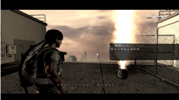 梅和她妈失散了!(目标:找到梅)从红色柱子爬进游乐园,进去后往右边走,杀死敌人,会看见楼梯上去打开锁后,带梅离开!背起梅后发生余震(目标:上船)地上全部都是洪水只能往高处走,在楼顶见到梅她妈后,送着她们上船!剧情完后,通关了!!! 主角真是个好人,遗憾的是通关了还没找到老婆和女儿