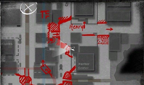 游戏中没有任何指引,只是不断的在地图上更新目的地,但是在去往目的地的途中有很多障碍,每次经过一出,都会在地图上随笔涂鸦,可能是为了更符合当时紧张的场景。