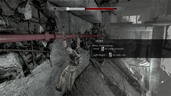 爬到这里后沿着水管爬过去,到中途水管会断,冲坡的时候按左键和A翻滚。