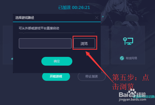 加速器吃鸡路径设置步骤五:点击“设置游戏路径”选项以后,界面上会显示一个弹窗。点击弹窗上的“浏览”选项。