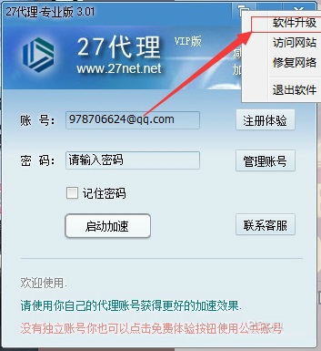 1、下载安装后,双击打开,点击使用即会跳转到27代理官网