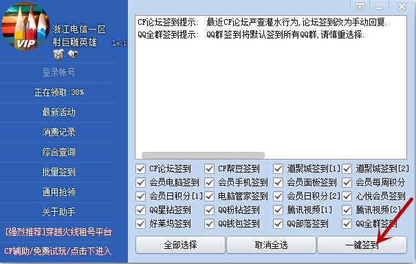 CF聚豆、CF帮豆、CF论坛、QQ会员、QQ钱包、QQ群等多种功能一键签到。