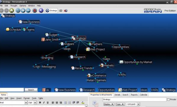 Personalbrain是一款非同寻常的思维导图软件。传统的思维导图软件如MindManager采用传统的平面线性的表达方式,所有的主题,项目,附件以及他们的连接都在一个平面内展示。PersonalBrain则采用了动态的立体网络呈现与之关联的所有想法以及他们之间的联系。传统的思维导图只允许由中心思想向四周辐射,且每个节点只有一个父节点,这是一个树形结构。而PersonalBrain则可以有多个父节点、多个跳跃节点、多个子节点,数据量越大越能体现其优势,越能开发您的脑力,激发您的灵感,思维导图是一种革命性的思维工具,是一种画出来的想法。简单却又极其有效!它是一幅幅帮助你了解并掌握大脑工作原理的使用说明书。它不仅能够增强使用者的记忆能力和立体思维能力(思维的层次性与联想性),而且还能增强使用者的总体规划能力。