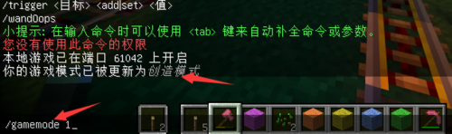 6、此时键入gamemode 1指令并回车,可切换至创造模式。