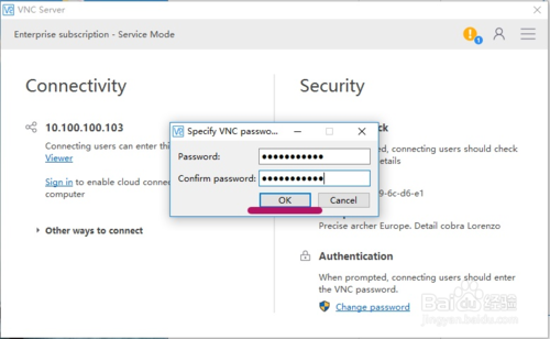 我们可以点击 Authentication 里的 Change password 来设置初始访问密码,这里的密码即为客户端访问该服务器时的密码,设置完要重输一遍来确认,之后点击 OK 即可。一般来说,设置好密码之后就可以通过远程客户机访问了