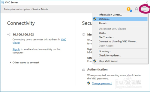 然后进入主界面,可以看到左边 Connectivity 板块为连接相关的信息,显示目前的服务器端IP为10.100.100.103;右边为 Security 为安全相关信息,上边 Identity check 为一些身份检查等信息,下方 Authentication 为认证信息。