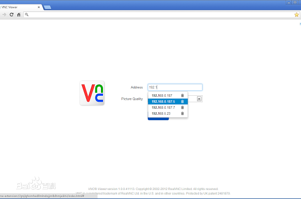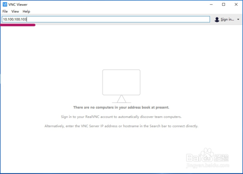 在台式机服务器上开启 VNC Server后,在笔记本客户端上打开 VNC Viewer,主界面如下,相当简洁,你可以直接在上方数据栏里输入服务器端的主机名或IP地址,即可建立连接。