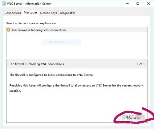 2)、如果VNC Server已经开启,网络也正常联通,还是访问不到服务器端,那可能是远程服务器端主机的安全软件或防火墙自动阻断了VNC的连接,这时先在托盘中右键点开VNC Server的选项组,打开Information Center,然后在message选项卡中可以看到一条The firewall is blocking VNC connnection的报告提示,这时点击右下角的Resolve(重新解析)就可以了。