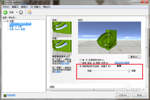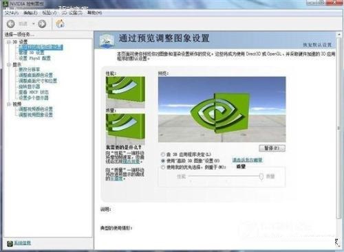 2、进去NVIDIA控制面板之后,我们来设置内容,首先进行图像设置,选择第三项使用我的优先选择,侧重于,将质量调到最高,点击应用,如下图所示: