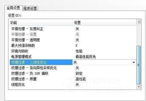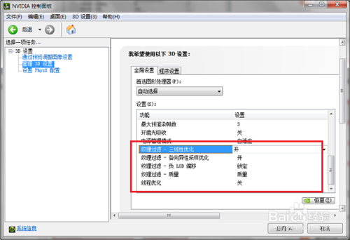4、在管理3D设置中将纹理四项全部开启,线程优化进行关闭,如下图所示: