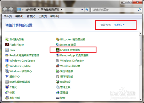 1、在win7系统上打开控制面板,以小图标的查看方式显示,点击NVIDIA控制面板,如下图所示: