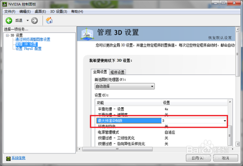 3、进行管理3D设置,将最大预渲染帧设置为3,如果电脑的cpu比较好,可以设置为5,如下图所示: