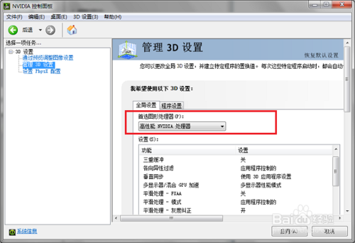 5、在首选图形处理器中选择高性能NVIDIA处理器,也可以设置为自动选择,管理3D设置完之后,点击应用保存,如下图所示: