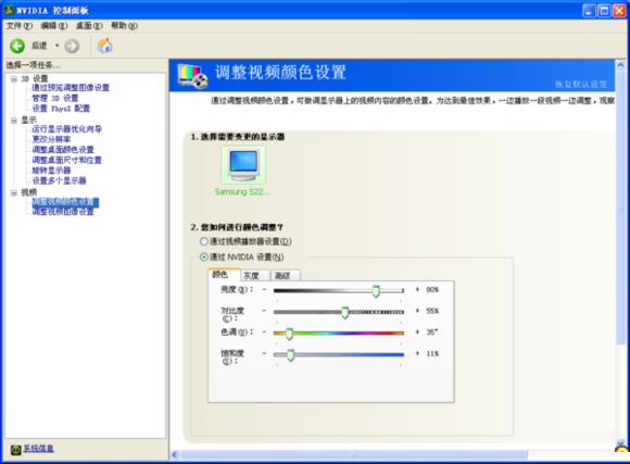2、调整桌面颜色,如图:亮度75%,数字振动89%,灰度0.92,色调9°
