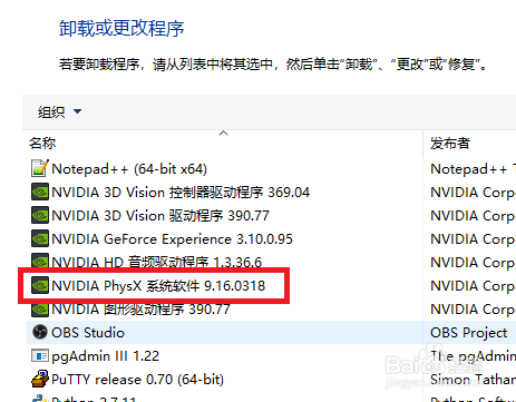 5、然后在需要卸载的nvidia physx上点击右键,选择卸载。这个时候就会弹出卸载页面,询问你是否