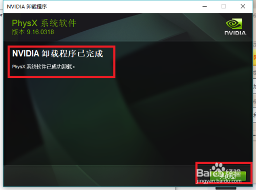 7、稍等片刻后,软件就会卸载完毕,点击右下角的关闭按钮结束卸载程序。这个时候控制面板的程序列表也会刷新,nvidia physx这个选项会消失,代表它被成功卸载。