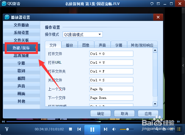 打开播放器设置中的热键/鼠标栏位置,