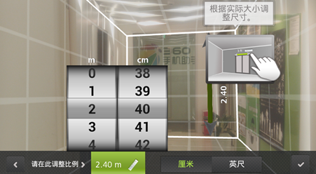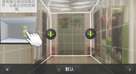 首先启动软件,用软件自带的照相功能拍了一张办公楼的电梯间,这就是小编每天工作的地方哈,每天小编在这里都要工作12个小时。拍照后,软件会自动对照片进行测算,几秒钟后你将看到这个界面。这时需要手工进行微调,只需要通过拖拉白线,对其空间的几条交界线,大概对准后点击屏幕右下角的尖括号。