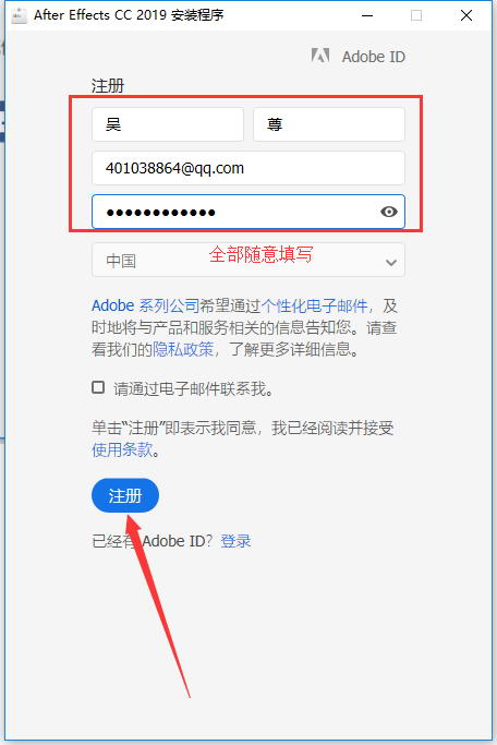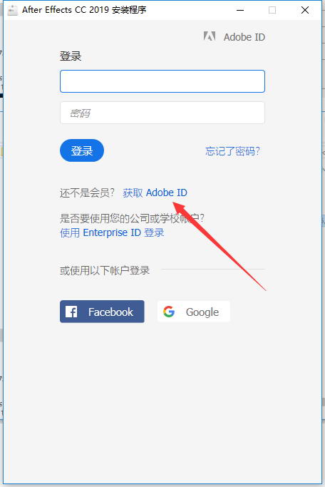 出现登录选框的时候,点击下方箭头所指的获取AdobeID。(如果你安装没有出现这个,可以直接进行下一步)如图三。