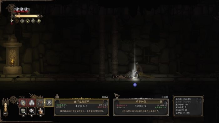 同时在游戏过程中,玩家还会接触到非常多的祝福、诅咒与疾病。顾名思义,游戏中一些祭坛能够提供给玩家增益的祝福效果,例如护盾、耐力回复、移动速度增加等;而一些敌人、场景则会频繁地让角色陷入各种麻烦的负面效果,除了失血、迟钝等传统Debuff,还有诸如“翻滚时会掉落身上物品”这样让人糟心的诅咒。当然玩家可以使用道具或者净化祭坛来消除诅咒和疾病的影响,但设计者也设计了一些能够消除你身上增益祝福效果的陷阱等着玩家去体验。