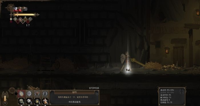“魂”味战斗作为一款2D横板动作游戏,《黑暗献祭》的战斗风格上比较偏向《黑暗之魂》的“慢节奏、找破绽”,类似于《盐与庇护所》。角色挥舞各种武器、做翻滚、格挡等动作都有比较明显的前摇,同时游戏还设计了耐力条来限制玩家的行动,初期耐力条有限的情况下玩家能连续做的动作十分有限,所以在面对敌人时玩家需要更多的是掌握攻防节奏而不能仅仅依靠反应来处理战斗。