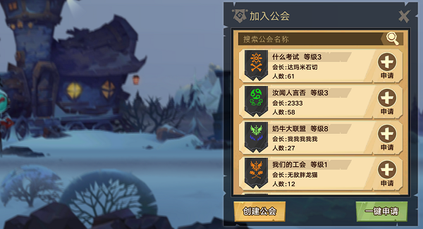 或者到达20级后,点击游戏右下方的“公会”,打开公会列表,点击对应公会后的“+”进行公会申请,等待公会管理同意即可。也可选择点击“一键申请”加入公会。