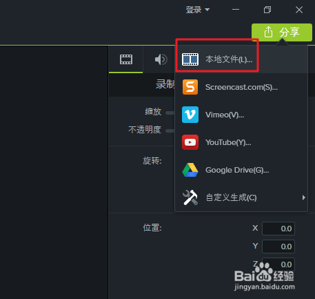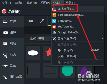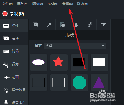 camtasia studio怎么导出视频?1、在编辑完或者录制完视频后,首先点击菜单栏上的“分享"。