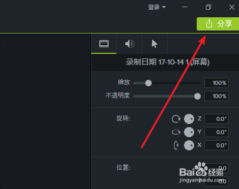 1、在编辑完或者录制完视频后,首先点击菜单栏上的“分享"。