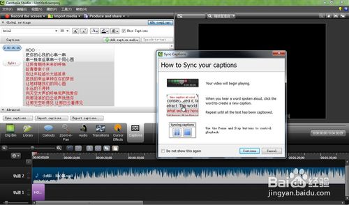 5、回到字幕,选择sync captions后弹出一个对话框,也就是在制作的时候我们可以暂停一下,调整时间。要将一句歌词与音乐对应起来,只需要单击一下这句歌词的首字即可。