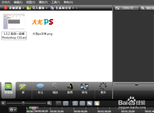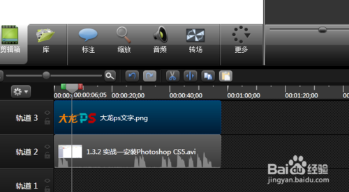4、下面即是将视频导入了,同样的操作,将视频直接拖入刚才所编辑的后方即可,视频文件根据其时间而决定其长短。