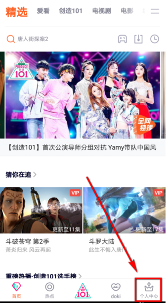2、进入到腾讯视频首页以后,在页面右下方点击【个人中心】选项。