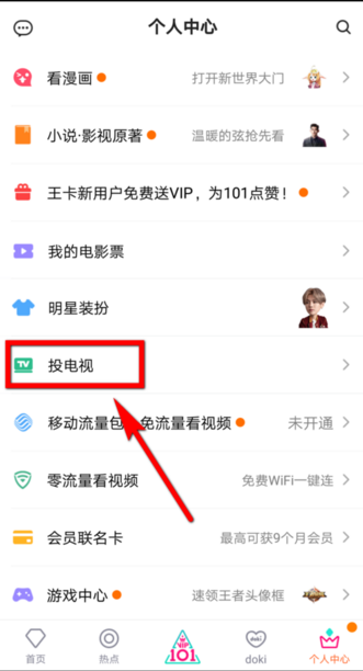 3、进入个人中心以后,在页面列表的菜单中单击【投电视】选项,如图所示。